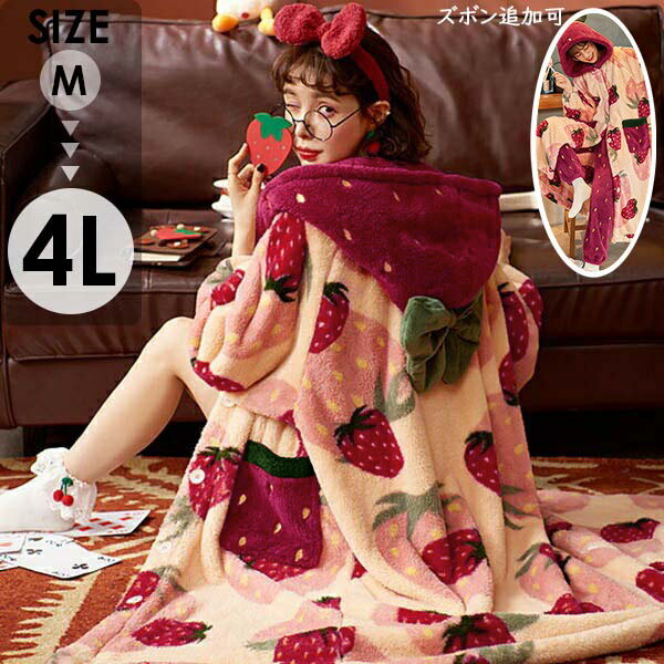 ルームウェア ナイトガウン 冬 あったか もこもこ イチゴ柄 可愛い パジャマ レディース マント コート 部屋着 寝間着 大きいサイズ 4L フード付き ポケット付き